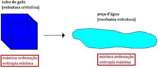 Quanto maior a desordem, entendida também como um “estado de vibração molecular”, maior a entropia do sistema. Nessa lógica, a água em estado gasoso teria uma entropia maior que a do gelo e, a água líquida, uma entropia intermediária (figura).